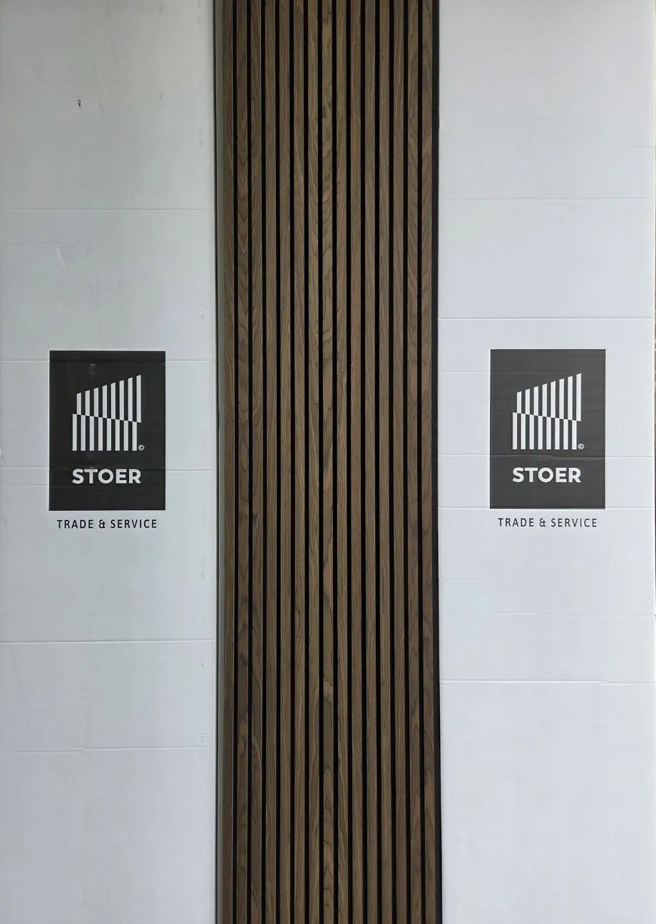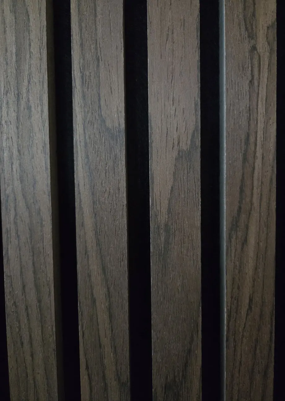 Het akoestisch wandpaneel in Donker Walnoot combineert een diepe, elegante houttint met hoorbaar akoestisch comfort. De warme uitstraling brengt direct sfeer in de ruimte, terwijl de geluidsabsorberende werking zorgt voor rust en balans.
